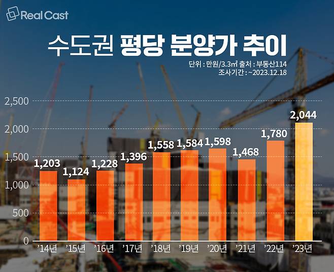 속출하는 미계약의 주된 원인으로는 분양가가 지목되고 있습니다. 올해 수도권 새 아파트 분양가는 결국 3.3㎡당 2천만 원까지 돌파했죠. 부동산114 자료에 따르면 올해 수도권 평균 분양가는 3.3㎡당 2,044만 원으로, 1,780만 원을 기록한 지난해 보다 무려 14.8% 올랐습니다.