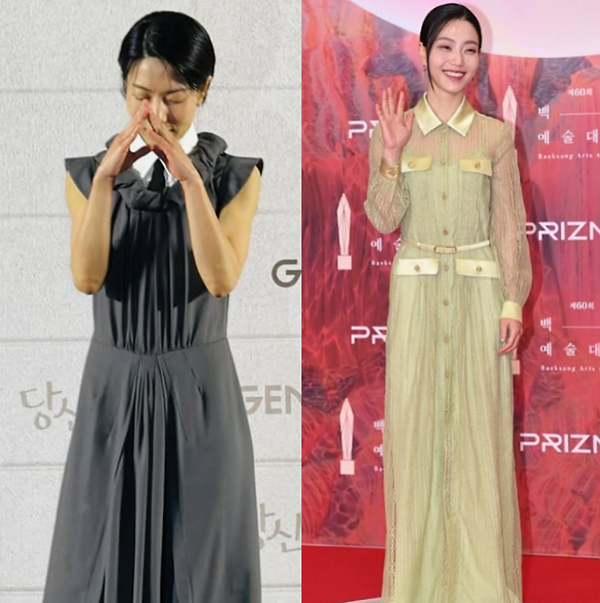 김신록 님이 선택한 그레이 톤의 셔츠형 드레스는 기본적으로 단정하고 이지적인 무드를 바탕에 두고 있습니다. 마치 클래식한 셔츠를 롱 드레스로 확장시킨 듯한 실루엣을 보여주며, 포멀하면서도 편안한 인상을 남겼습니다.
