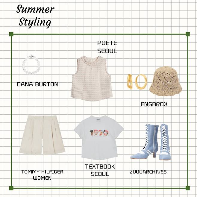 마지막은 바캉스룩이야!텍스트북 서울 티셔츠나과하지 않은 컬러에 포에트서울 탑을 입고!타미힐피거우먼 반바지로 컬러를 맞춰 입자~그리고 앵브록스 모자와 귀걸이, 다나버튼 팔찌랑 같이 착용해주고마지막으론 패피들 느낌 살려서 스포티한 2000아카이브 부츠 제품을 착용해주자~ ㅎㅎ