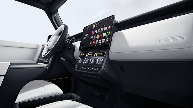 실내는 원형과 직사각형 디자인 요소를 대거 채용했으며, 노란색 포인트로 액센트를 줬다. 중앙 제어 화면 아래에는 에어컨 송풍구와 조절 노브가 위치해 있다.