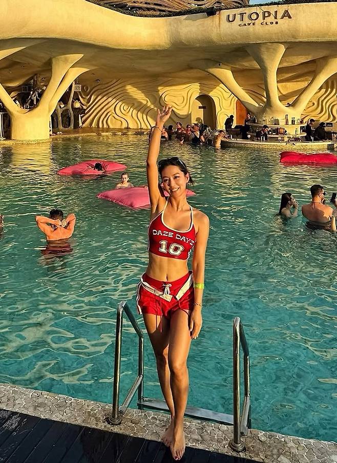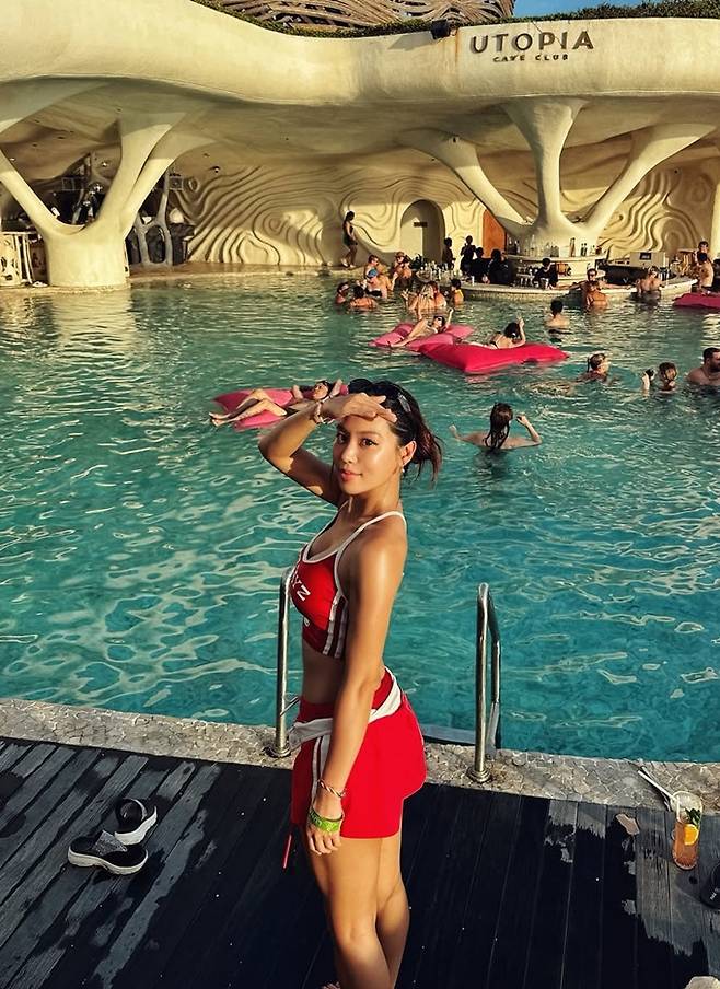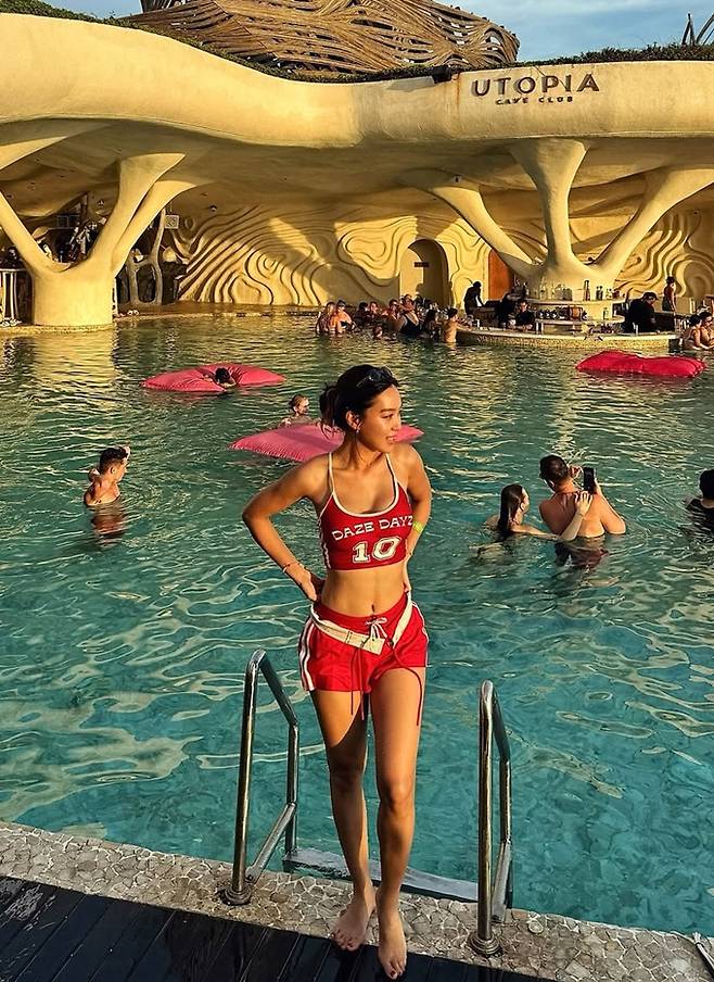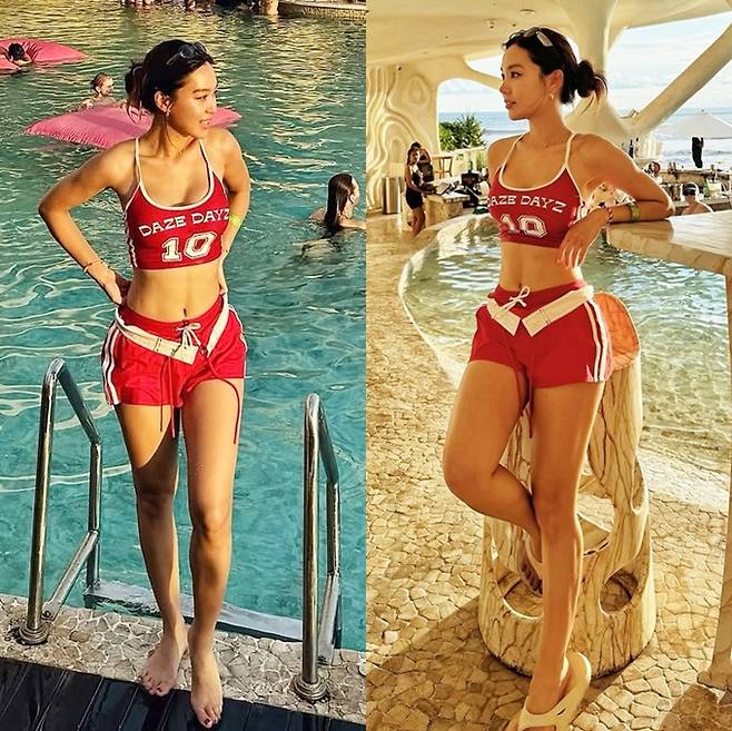 공개한 사진에서 김희정은 투 라인 빨간색 반바지에 스포츠톱을 매치한 레드 컬러의 스윔웨어 리조트룩으로 9등신 비율의 핫한 몸매를 뽐냈다.