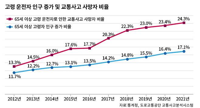 고령 운전자의 교통사고 건수가 늘어나는 것은 사실이다. 특히 사망률이 높다. 지난해 3월 한국교통안전공단이 최근 10년간(2012~2021년) 전체 교통사고 사망자를 분석한 결과 고령 운전자로 인한 사망 비율이 13.3%에서 24.3%로 11%포인트 증가한 것으로 나타났다(아래〈그림〉 참조). 또 최근 5년간(2017~2021년) 운전 미숙으로 인한 사망자 발생 사고 중 30%가 65세 이상 고령 운전자에 의한 것이었다.