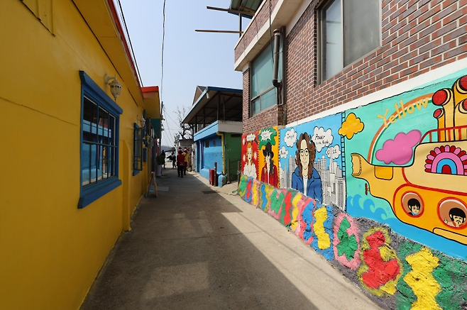 동화 같은 골목길이 이어지며, 다양한 테마의 벽화들이 장식되어 있습니다.