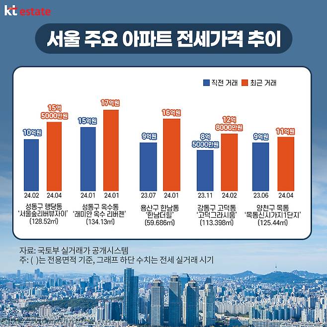 강동구 고덕동 ‘고덕그라시움’ 전용 113.398㎡ 역시 지난 2월 12억8000만원(8층)에 새로 세입자를 들여 지난해 11월 계약된 8억5000만원(29층)보다 4억3000만원 뛰었습니다. 양천구 목동 ‘목동신시가지1단지’ 전용 125.44㎡도 지난 4월 17일에는 11억원(2층)에 신규 전세 계약이 체결되면서 지난해 6월 9억원(3층) 대비 2억원가량 올랐습니다.
