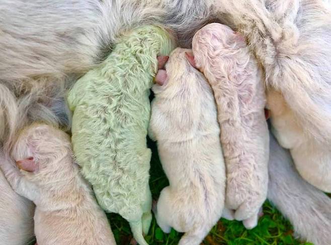 세상에 갓 태어난 꼬물꼬물한 강아지 형제들 사이에서, 마치 동화 속에서 튀어나온 듯 신비로운 초록색 털을 뽐내는 아기 강아지가 나타나 전 세계의 이목을 사로잡고 있습니다.