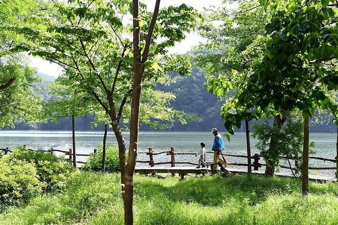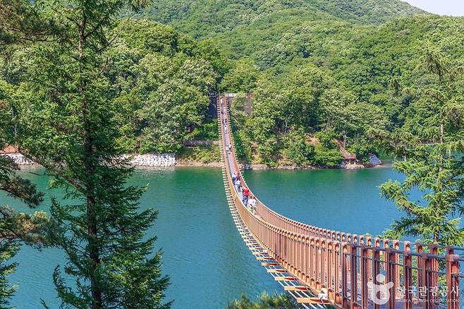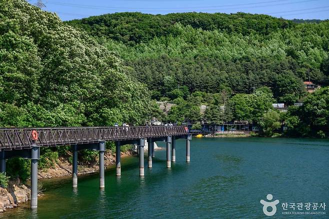 호수 위를 가로지르는 출렁다리(길이 220m) 는걷는 내내 호수와 하늘이 한눈에 들어오죠. 잔잔한 물결 위로 비치는 하늘빛이 계절마다 색을 달리하며 감성을 자극합니다.