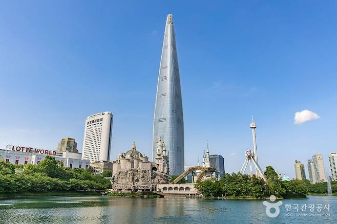 - 롯데타워 반사샷 — 도심 스카이라인 + 호수 뷰