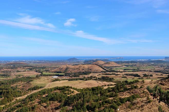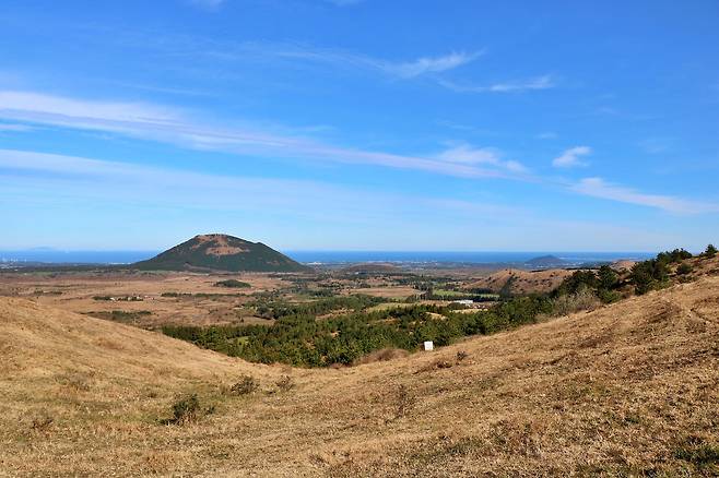 정상에 오르면 시원하게 펼쳐지는 경관이 기다린다. 광활한 들판 너머로 우도와 성산일출봉이 멀리 자리하고, 주변으로 펼쳐진 푸른 바다가 시야를 더욱 넓힌다.