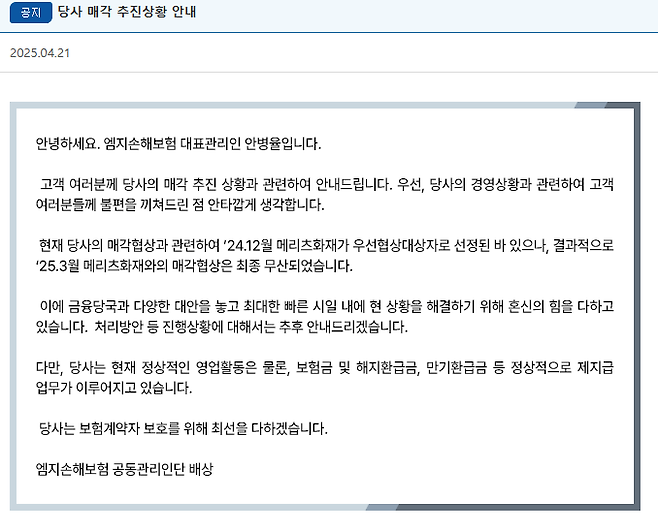 금융위원회 측은 앞선 2일, MG손해보험 측에 '일부 영업정지 예정 사전 통지서'를 전달했으며 12일까지 의견 제출을 요구했다. MG손해보험은 지난 2022년 금융당국으로부터 부실금융기관으로 지정됐다. 이어 2023년 2차례 공개매각이 무산됐고, 2024년 7월에도 3차 매각이 무산됐다.