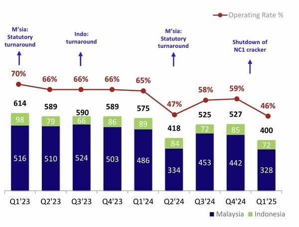 LC타이탄은 말레이시아와 인도네시아에서 각각 기초화학 설비를 두고 있으나 전체 생산량의 90% 이상은 말레이시아에서 나오고 있다. 지난해 전체 가동 가능한 시간 중 실제로 운영된 건 50~60%로 신규 생산을 최소화했다. 가동률 가이던스를 감안할 때 올해도 이같은 추세가 이어질 전망이다.