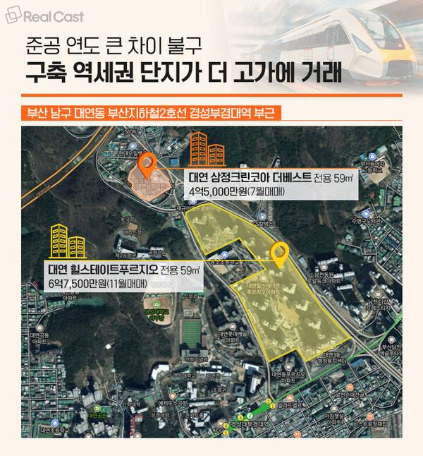 반면, 2022년 준공 돼 입주 3년차로 접어드는 새 아파트지만 경성부경대역과 900m 가량 떨어져 있는 대연동에 위치한 ‘대연 삼정그린코아 더베스트’ 아파트 전용 59㎡는 지난해 가장 고가에 거래된 가격이 4억5,000만원(7월) 이었습니다.