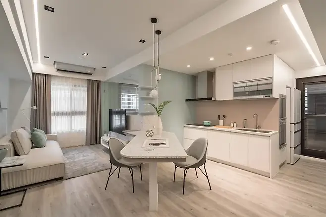 호스트의 거실은 동선을 여유 있게 설계했다. 현관에서 주방 구역으로 이어지기 전, 반드시 이 거실을 통과하게 되는데, 이 완충 공간이 주는 ‘잠깐의 멈춤’이 집에 온 이들에게 일종의 여백이 된다. 밝은 톤의 대리석으로 마감한 TV 벽면과 중량감 있는 소파는 균형감과 따뜻함을 고르게 나눈다.