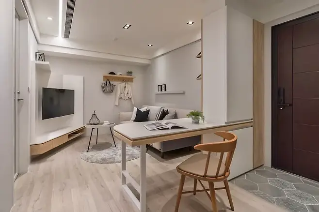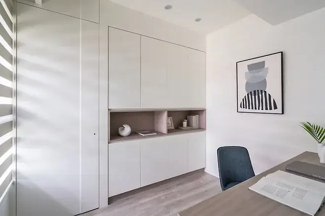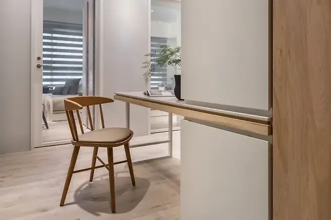호스트의 서재는 침실과 이어진 구간이지만, 순백색의 벽면과 묵직한 우드 텍스처의 책상 배치로 분리감을 확보했다.