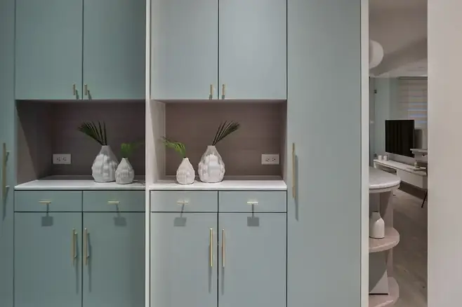 반면, 조카의 공간은 육각형 패턴의 바닥 타일로 활기를 넣었다. 이 패턴은 바로 연결된 수납장과 바 테이블까지 연장돼, 입구부터 젊고 생기 넘치는 에너지가 물씬 풍긴다.