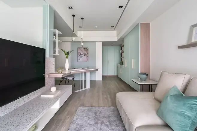 조카의 집은 이와는 달리 시야 확장을 위해 TV장을 사선으로 배치했다. 비스듬한 각도는 단순히 시청 편의성에 머물지 않고, 전반적인 공간의 선들을 이끌며 입체감을 부여한다. 게다가 벽면을 따라 설치된 레벨감 있는 행잉 오브제가 시선을 위아래로 이끈다.