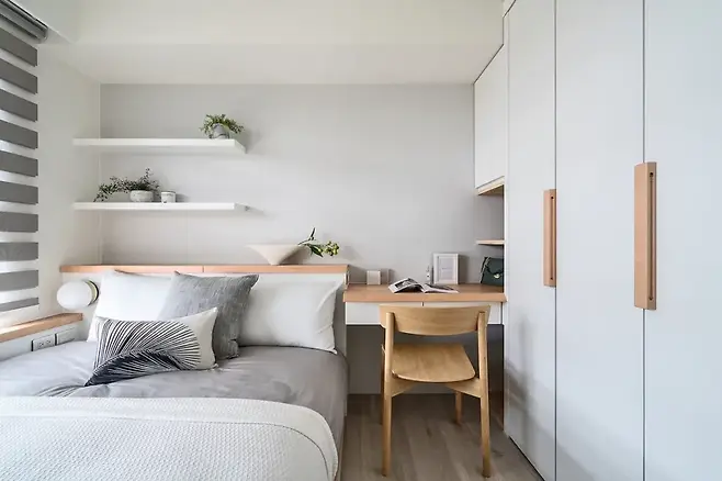 조카의 침실은 기능성에 초점을 두었다. 침대 하부에는 서랍장 수납 구조를 두고, 구조가 드러나지 않게 정리된 대용량 수납이 가능하다. 투명 유리 도어로 마감된 옷장 덕분에 개방감도 확보했다. 벽면은 조카가 선호하는 원목 프레임 벽 장식으로 개성 있게 채워졌다.
