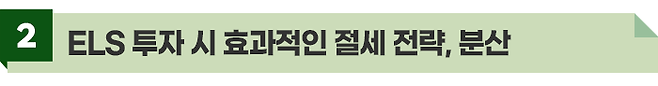ELS 투자 시 절세를 위해 활용할 수 있는 방법으로 수입시기를 분산시키는 것이 있는데, 여러 개의 ELS 등에 분산투자하거나 월지급식 상품에 가입하는 것이 있습니다.