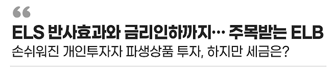 이런 이유로 ELS를 대신해, 은행의 예∙적금보다 높은 금리를 제공하면서 원금을 지킬 수 있다는 투자 안정성까지 내걸고 있는 ELB가 요즘 주목을 받고 있는데요.