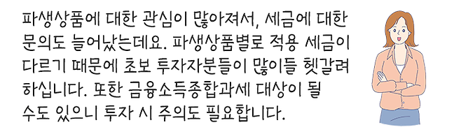 잘은 모르지만 수익률은 높은 대신 원금손실이 날 수도 있는 것이 파생상품이라고 하던데, 괜찮을까요? 게다가 세금은…