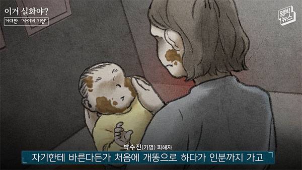 박수진(가명)/피해자 “갓난아이를 나무 막대기로 때려야 되고.. 사람 인분을 모아서 짓이겨서 자기 자식한테 바르게 한다든가, 자기한테 바르게 한다든가..처음에 개똥으로 하다가 인분까지 가고, 밥을 안 주고 개밥만 먹인다든가..”