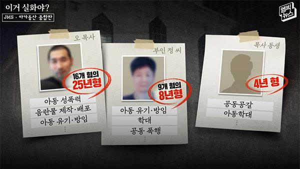 오 목사와 일가에겐 어떤 처벌이 내려졌을까. 올해 56살이 된 오 목사 본인은 아동성범죄와 학대 등 16개 혐의로 지난해 대법원에서 25년 형이 확정됐습니다. 공범인 부인과 오 목사 동생은 각각 8년과 4년 형에 처해졌습니다. 어린 신도들을 성추행했던 오 목사 아들은 기소는 됐지만 현재 불구속 상태로 재판을 받고 있습니다.