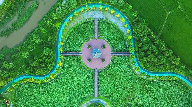 신정호 정원의 중심은 단연 호수와 그를 감싸 안은 산책로다. 총 5km 길이의 수변 산책로는 남녀노소 누구나 편하게 걸을 수 있도록 평탄하게 조성되어 있어 조깅이나 자전거 타기를 즐기는 이들의 발길이 끊이지 않는다.