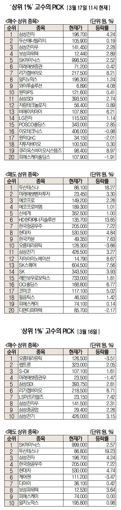 미래에셋증권은 자사 고객 중 최근 1개월 수익률 상위 1% 투자자들의 매매 종목을 집계해 실시간·전일·최근 5일 기준으로 모바일트레이딩시스템(MTS)을 통해 공개하고 있다. 해당 통계는 미래에셋증권의 투자 의견과 무관한 단순 정보 제공이며 특정 투자 성과를 보장하지 않는다.