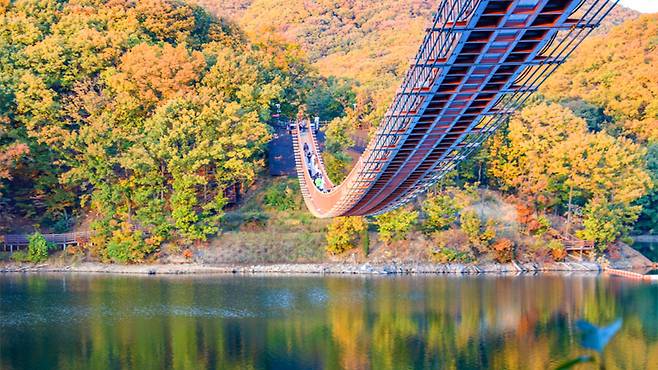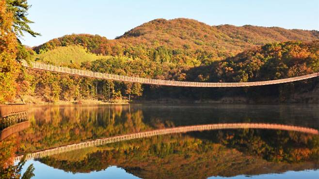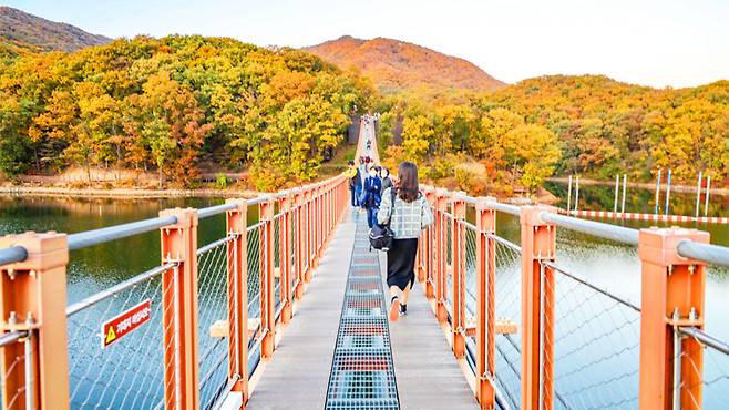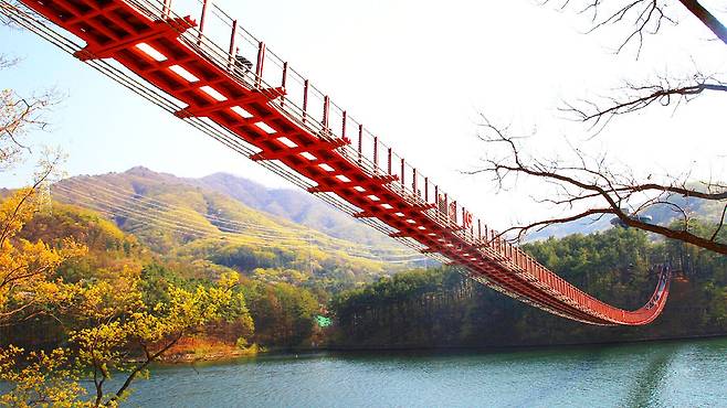 마장호수의 백미는 단연 ‘출렁다리’. 국내 최장 길이(220m)의 호수형 출렁다리는 폭 1.5m로 다소 아찔한 느낌을 주지만, 안전성은 물론 설계미까지 갖춘 명소다.