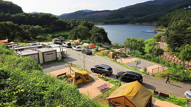 호수 가장자리에 자리한 캠핑장은 숲과 물이 어우러진 고요한 쉼터다.