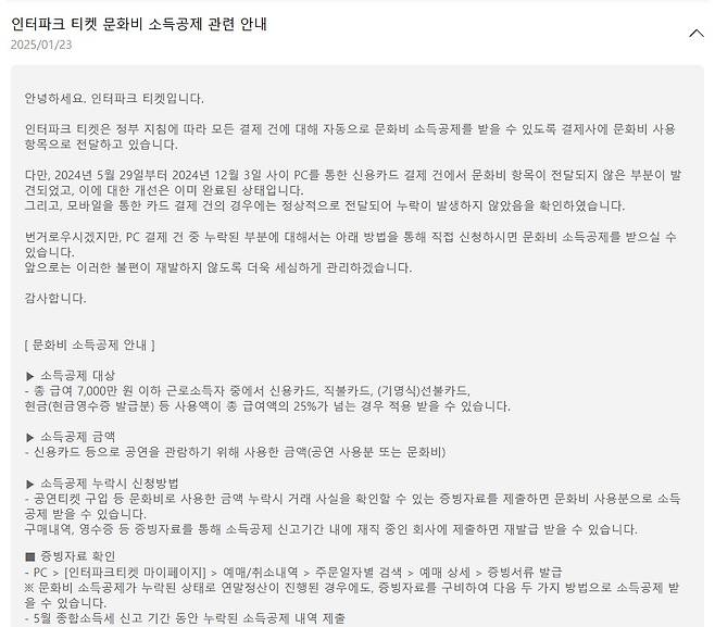 지난해 5월 29일부터 12월 3일까지 인터파크 티켓 사이트에서 PC를 통해 신용카드로 결제한 내역 중 일부가 문화비가 아닌 일반 결제로 처리됐다. 이에 따라 원래 혜택을 누릴 수 있었던 문화비 소득공제 대상에서도 제외됐다.