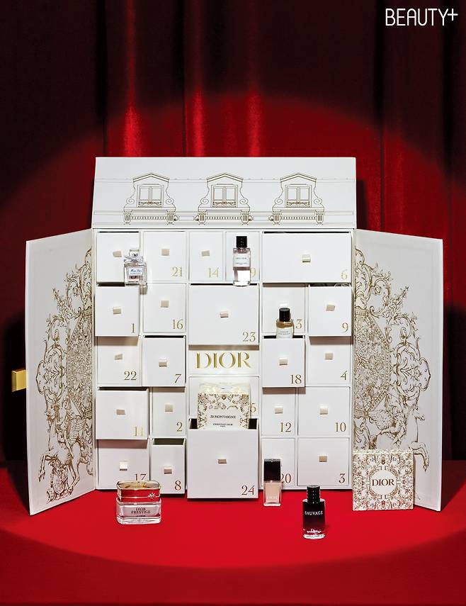 파리 몽테뉴 30번가에 있는 디올의 부티크를 재현한 어드벤트 캘린더. 작은 서랍 하나하나에 디올 뷰티를 대표하는 미니어처 아이템이 들어 있다. 향수 미니어처 9종과 라이프스타일 5종, 스킨케어 4종과 메이크업 6종까지 구성도 알차다. 패키지는 수납장으로 재활용하기도 훌륭! 88만원대.