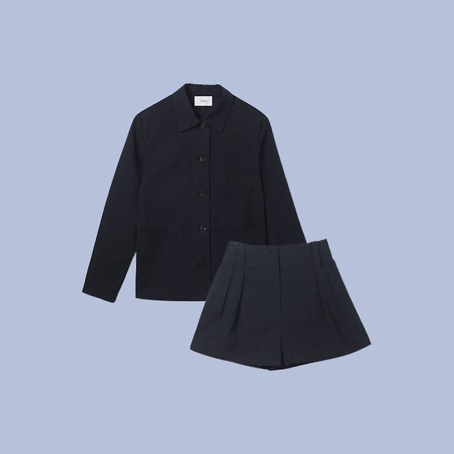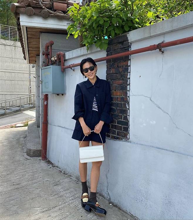 김나영이 착용한 아밤의 네이비 캐롤 코튼 셋업. 재킷과 쇼츠를 단독으로 매치해도 멋스럽다.