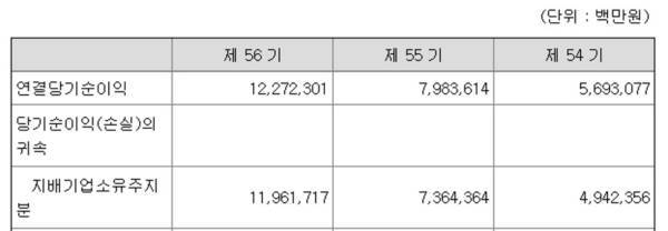 현대차의 2023년 결산(제56기) 기준 연결 당기순이익은 12조2723억원입니다. 그런데 지배주주 순이익은 11조9617억원이죠. 현대차의 배당은 위의 12.27조가 아닌 11.96조를 중심으로 계산해야 한다는 의미입니다.