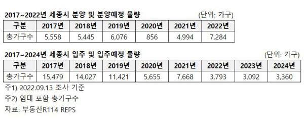 금리 인상 여파에 계획 인구 이상 신규 공급 물량이 꾸준히 풀리면서 집값 방어가 어렵다는 것. 실제로 부동산R114에 따르면 올해 세종시 분양예정 아파트는 7284가구로, 지난 2년치보다 2000가구 이상 많다. 입주 예정 물량도 꾸준하다. 매년 1만 가구를 훌쩍 넘겼던 2017~2019년보다는 적지만, 올해부터 2024년까지 해마다 3000가구 이상이 입주를 앞두고 있다.