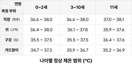 원래 신체 부위별 측정 체온이 다르기 때문에, 귀체온과 겨드랑이 체온은 다른게 맞습니다. 측정 부위에 맞는 기준온도로 체온을 확인하고, 체온계에 따라 측정온도가 달라질 수도 있으니 이를 주의해서 올바른 방법으로 아이의 체온을 재시기 바랍니다!