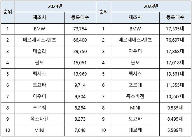 볼보(1만5,051대)와 렉서스(1만3,969대)는 단단한 팬층을 바탕으로 각각 4위와 5위를 유지했다. 이어 토요타(9,714대)와 아우디(9,304대), 포르쉐(8,284대), 폭스바겐(8,273대), MINI(7,648)가 6~10위에 안착했다. 2023년에는 7위까지 1만 대 판매를 넘긴 반면, 이번에는 5위 렉서스까지만 1만 대 이상의 실적을 올렸다. 10위권 내에서 판매량이 가장 줄어든 브랜드는 아우디였다.