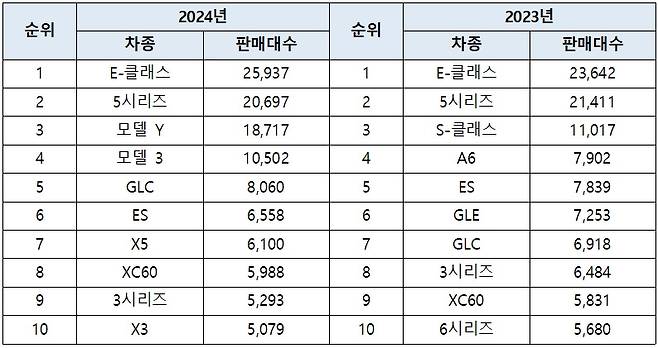 BMW가 종합 판매대수 1위에 올랐다면, 메르세데스-벤츠는 모델별 판매 1위를 배출했다. 주인공인 E-클래스(2만5,937대)는 연초 출고 문제를 겪으며 5시리즈에게 왕좌를 내주는 듯 싶었으나, 보란 듯이 5,000대 가량 앞지르며 2024년을 마무리했다. 특히 지난 12월에는 5시리즈(1,750대)보다 2배 이상(3,916대) 판매했다. 압도적 인기로 3·4위를 나란히 꿰찬 테슬라 듀오의 성적도 눈에 띈다.