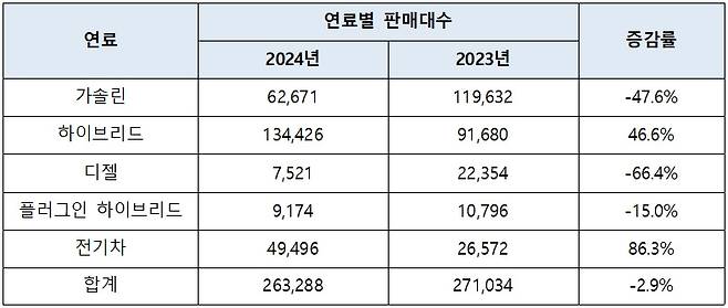 연료별 판매량 점유율 변화는 전년도와 비슷한 분위기를 이어갔다. 2만 대 이상 판매를 유지했던 디젤 모델은 이제 7,000대 수준으로 곤두박질쳤다. ‘전기차 캐즘’이라는 키워드에도 불구하고 전기차 판매 비중이 86.3% 상승했는데, 이는 테슬라의 통계수치 합류로 인한 영향일 가능성이 크다.