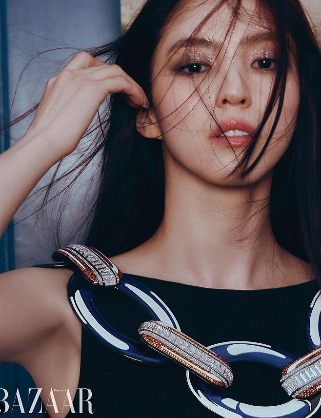 한소희는 눈두덩이에 글리터 섀도를 발라 화려한 메이크업을 완성했다.