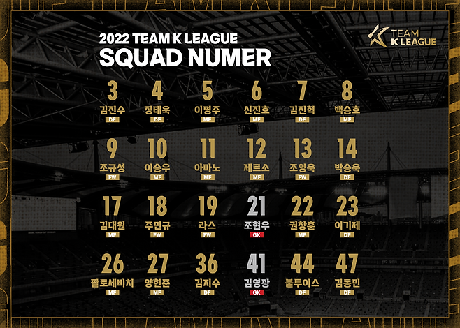 미드필더는 이명주 5번, 신진호 6번, 백승호 8번, 이승우 10번, 아마노 11번, 제르소 12번, 김대원 17번, 권창훈 22번, 팔로세비치 26번, 양현준 27번으로 정해졌고, 공격수는 조규성이 9번, 조영욱이 13번, 주민규가 18번, 라스가 19번 유니폼을 입고 경기장에 나서게 됐다.