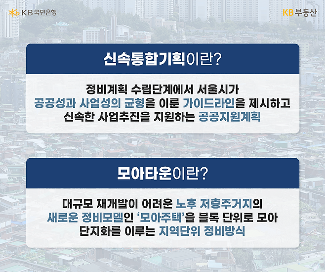 그동안 정비사업의 경우 규제와 절차 과정이 많고 긴 데다가 지역적 특성에도 불구하고 획일적으로 규제해 온 측면이 많았습니다. 개발이 필요한 지역임에도 계획과 설계를 조정하는 과정에서 사업이 장시간 지연되는 경우도 많았고요. 신속통합기획과 모아타운은 이러한 문제점을 해결하고 신속한 도심 정비를 위해 서울시가 본격 추진하는 서울형 정비사업 모델입니다.