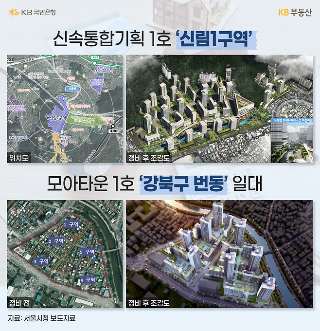 신속통합기획을 통해 개발되는 대표적인 사례로는 서울 관악구의 ‘신림1지구’가 있습니다. 서울 서남권에서 저소득층이 밀집한 대표적인 노후주거지로, 지난 2006년 재정비촉진지구 지정 이후 무허가 건축물, 지역내 갈등 등의 문제로 추진이 지연돼 왔었는데요. 특히 지난 2017년 촉진계획 변경을 신청한 이후 사업 찬·반 갈등 등의 이유로 수 년 간 입안 절차 진행이 더디게 진행이 됐었습니다. 그러다 신통기획 추진을 통해 입안부터 심의까지 7개월 만에 빠르게 촉진계획을 결정할 수 있었습니다.