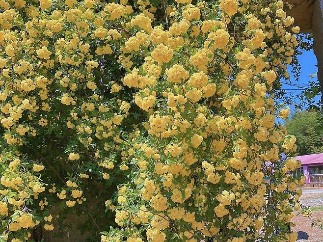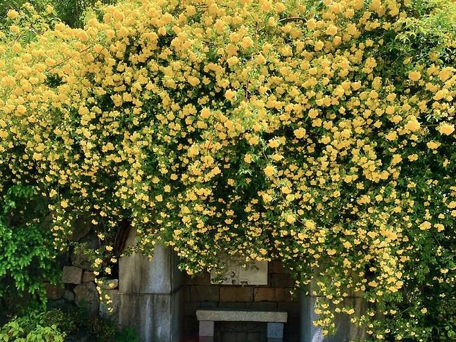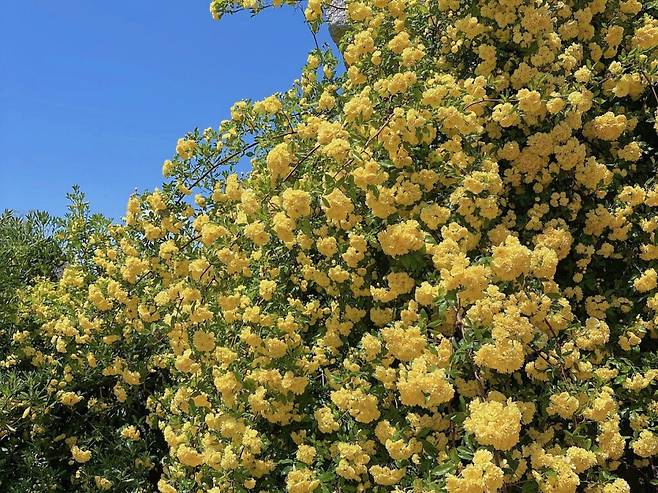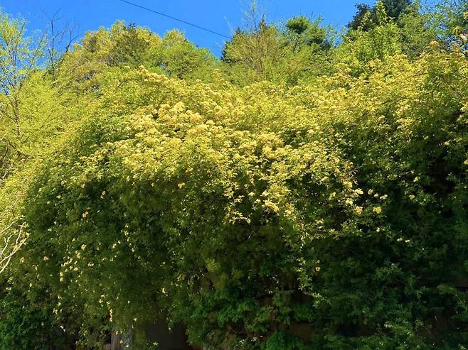 울타리에 기대 자라며 담장을 가득 메우는 ‘목향장미’는 일반적인 장미와는 다르다.