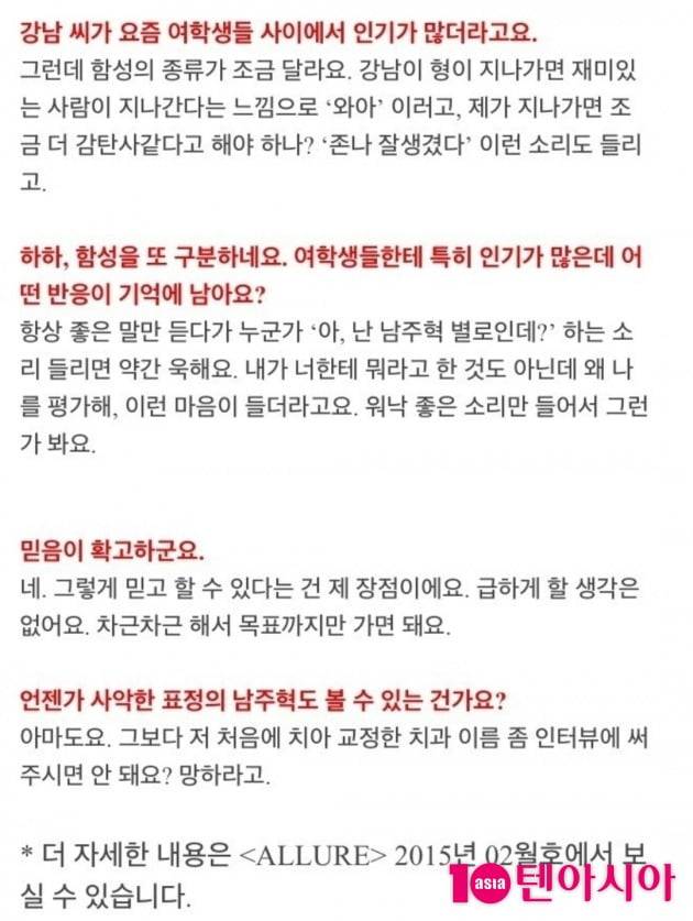 "강남 형이 지나가면 재미있는 사람이 지나간다는 느낌으로 '와아'이러고, 제가 지나가면 조금 더 감탄사같다고 해야 하나? 'xx 잘생겼다' 이런 소리가 들리고." / "항상 좋은 말만 듣다가 누군가 '아, 난 남주혁 별로인데?'하는 소리가 들리면 약간 욱한다. 내가 너한테 뭐라고 한 것도 아닌데 왜 나를 평가해. 이런 마음이 들더라. 워낙 좋은 소리만 들어서 그런가." / "그보다 저 처음에 치아 교정한 치과 이름 좀 인터뷰에 써주시면 안 돼요? 망하라고." (2015년 얼루어 2월호 인터뷰)