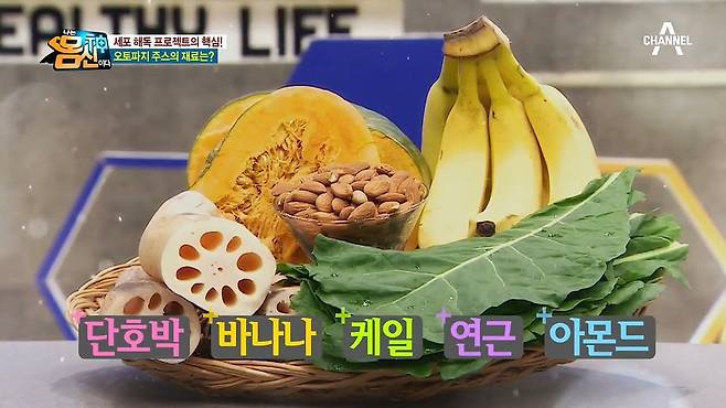 주요 재료는 단호박, 연근, 케일, 바나나, 아몬드인데요. 이들은 각각 다음과 같은 효능을 지니고 있습니다.