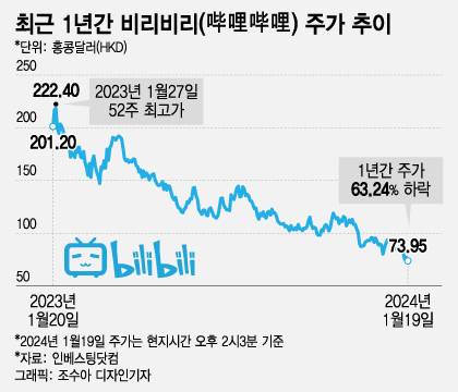 지난 19일 홍콩 증권거래소에서 비리비리는 전일 대비 3.82% 내린 74.3홍콩달러에 거래를 마쳤다. 주가는 올해 들어서만 20.61% 빠졌다. 미국과 홍콩에 이중 상장된 비리비리는 기대치에 부합하는 실적에도 홍콩 증시의 약세에 따라 지난 1년간 63.36% 내렸다. 같은 기간 홍콩 항셍지수(-30.66%)의 하락률의 두 배를 웃돈다.