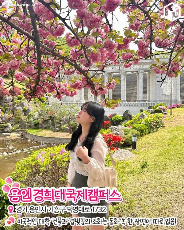 벚꽃 명소로도 잘 알려져 있는 용인 경희대 국제캠퍼스입니다. 수원과 용인의 경계에 있어 수원 겹벚꽃 명소로 알려져있기도 한데요. 경희대 국제캠퍼스는 이국적인 대학 건물들과 겹벚꽃이 어우러져 동화같은 겹벚꽃 풍경을 감상할 수 있습니다.
