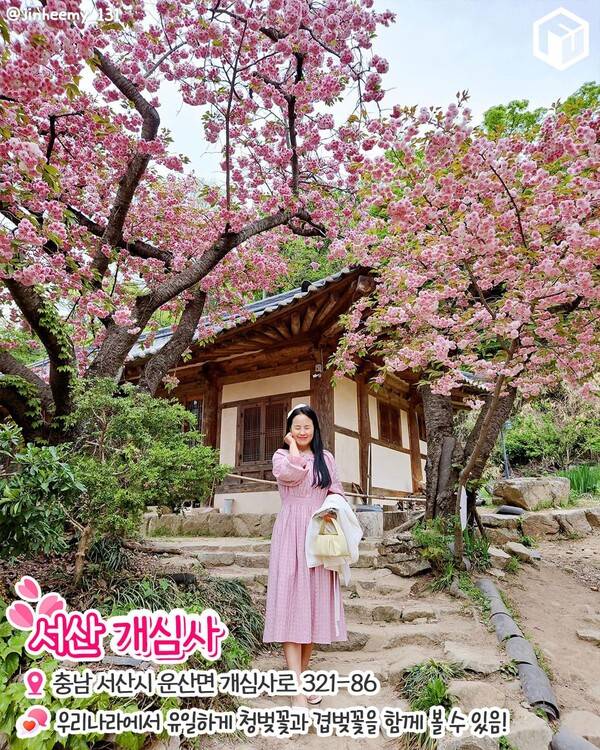 특히 개심사 내 안양루 마루에 앉아 여유롭게 휴식을 취하고 있자면 마치 신선놀음을 하는 듯한 기분까지 듭니다. 개심사의 '해탈문'을 들어가기 직전 오른편의 하늘을 가릴 정도로 풍성하게 만개한 겹벚꽃 터널도 놓치지 마세요! 개심사 근처의 문수사도 겹벚꽃 명소로 유명하니 함께 둘러보는 것도 추천합니다.