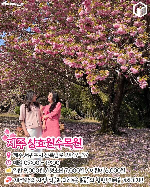 제주 서귀포시에 위치한 8만 평 규모의 상효원 수목원은 뒤로는 한라산을, 앞으로는 서귀포 앞 바다가 펼쳐집니다. 총 16개 테마의 정원이 조성되어 있는 상효원 수목원은 제주 고유의 자생 식물들과 겹벚꽃을 비롯해 다양한 봄꽃을 감상할 수 있습니다.