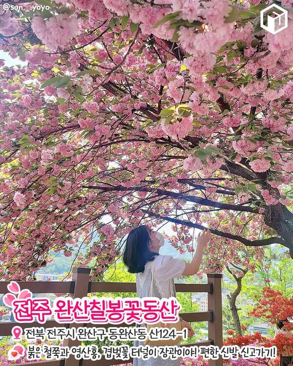 완산공원 정상 부근에 조성되어 있는 완산칠봉꽃동산은 매년 봄 붉은 철쭉 위를 분홍빛의 겹벚꽃이 덮은 '봄꽃 터널'이 펼쳐지는데요. 약 1만 그루의 겹벚꽃나무, 서부해당화, 철쭉이 화려한 풍경을 완성합니다.